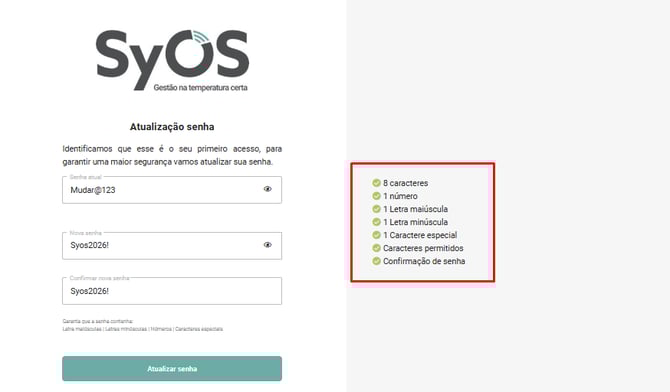6. Ao clicar em Login, você será direcionado para a página de atualização de senha. Nessa tela, informe a senha atual (a mesma enviada junto com o seu login) e, em seguida, defina uma nova senha que atenda aos requisitos do sistema, conforme destacado no quadro em vermelho.